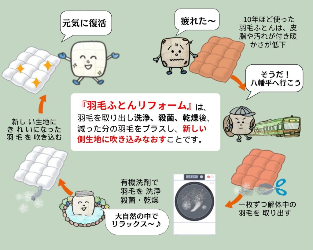「羽毛ふとんリフォーム」により、羽毛ふとんを長く大切にお使いいただけます。