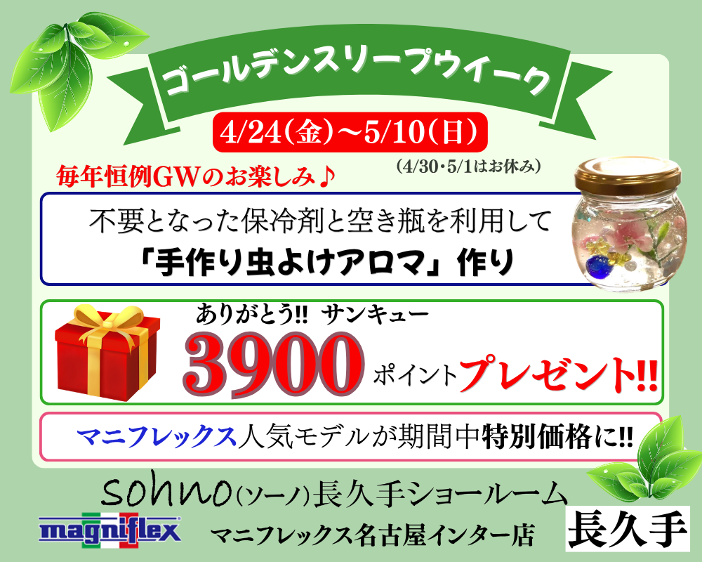 ※マニフレックス名古屋アプリ限定。ご購入39,000円(税抜)以上(期間中ひと家族様1回限り)